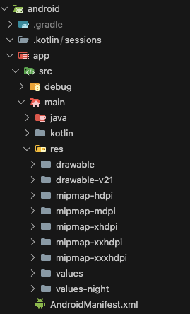 5-6. android - app - main - res 폴더로 선택한 모든 파일을 넣어줍니다 (삭제 후에 진행을 해도 괜찮고 덮어쓰기를 해도 괜찮습니다 AndroidManifest.xml 파일은 삭제하면 안됩니다)